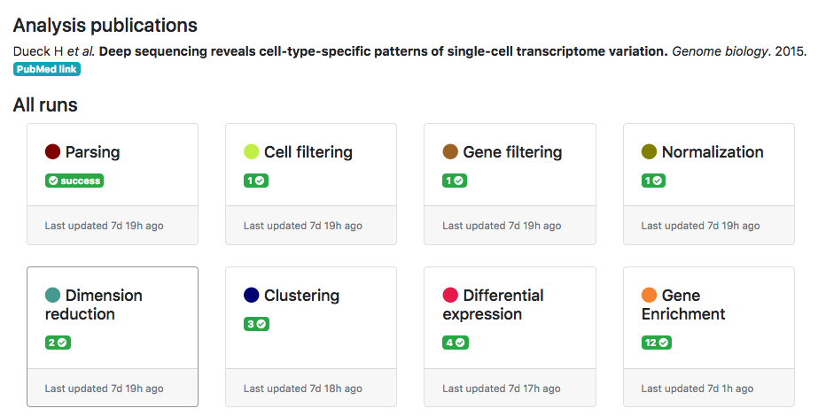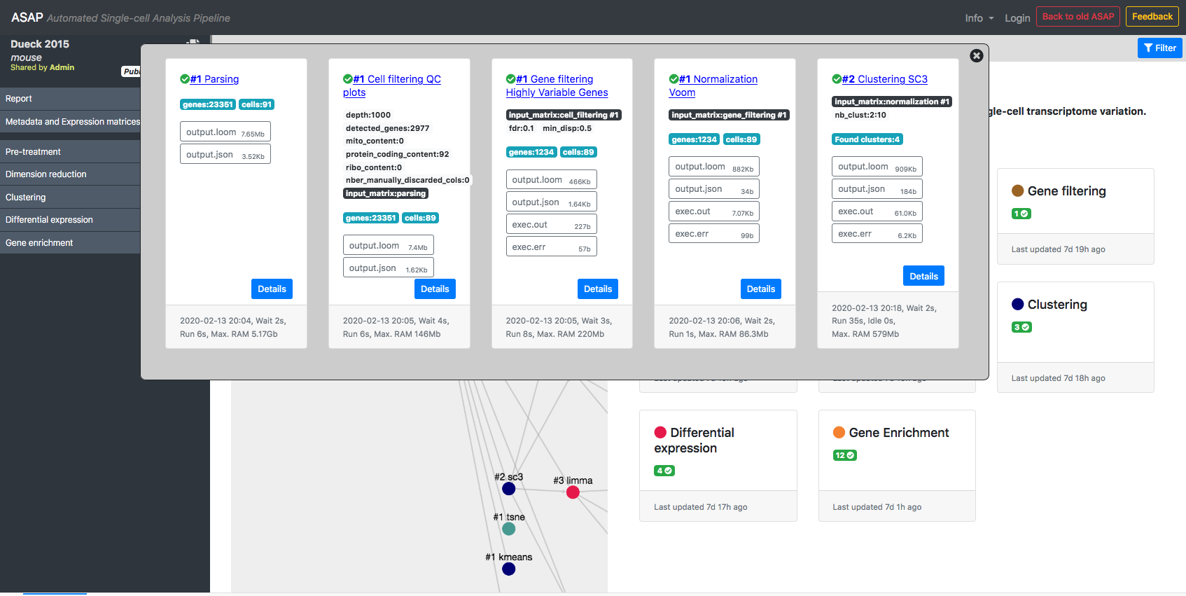 ASAP allows users to run in a flexible manner analyses from one step to another, so that customized pipelines can be produced directly by users. Then pipeline can get complexe and one needs to have an assistance to visualize the current structure of pipelines. In the Report section of a project, you can get a graphical representation of the current pipeline (Fig. 1) as well as the status of each analysis step (Fig. 2). Each node in the graphical view represents an analysis, and edges output-input relationships between analyses. Each node is clickable an provides the full lineage of analyses that resulted in the execution of this analysis (Fig 3).